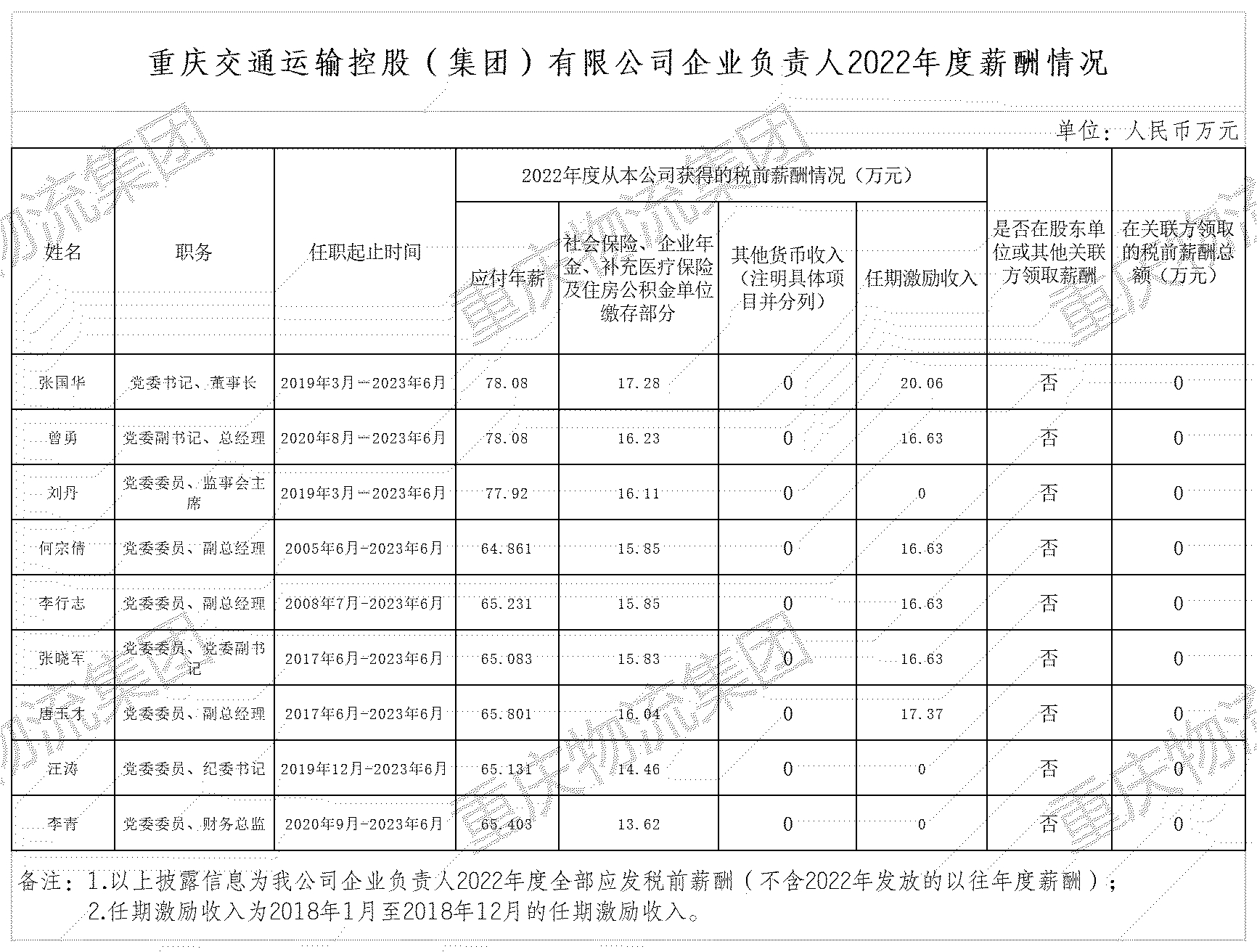 重庆交通运输控投(集团)有限公司企业����� �������Ƴ������������ �������Ƴ����������� �������Ƴ�������负责人2022年度薪酬情况